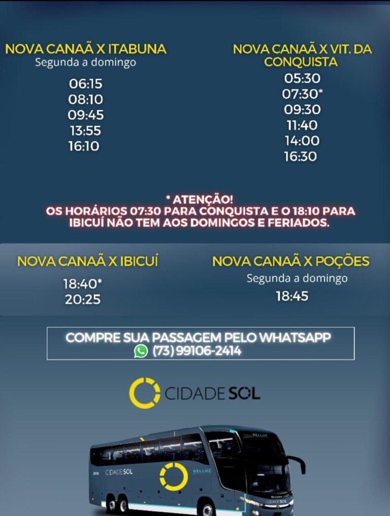 Se você vai viajar de Nova Canaã para Vitória da Conquista, Itabuna, Ibicuí ou Poções, reunimos aqui todos os horários